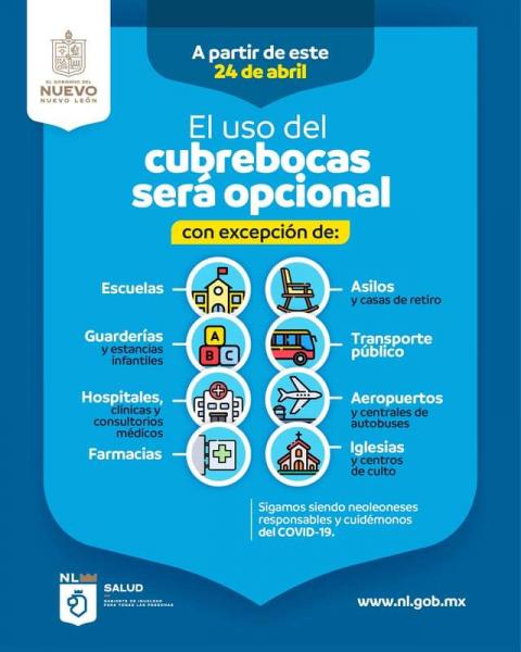 - A partir del 24 de abril el uso del cubrebocas será opcional